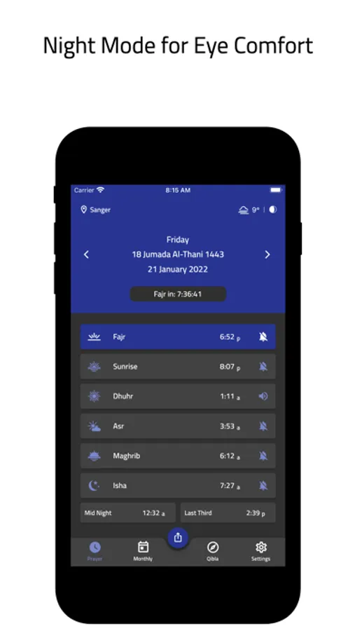- Display the daily prayer times and sunrise with midnight and the last third including the possibility of sharing the same as text or image via social media.