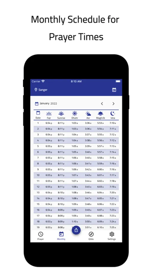- Display a beautiful and elegant monthly schedule of prayer times with the ability to share it with others as an image via social media