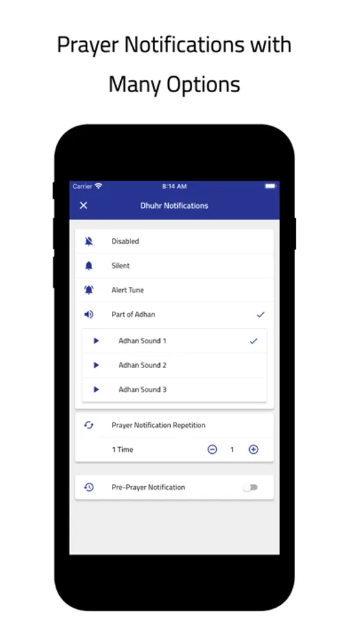 - Prayer times notifications with multiple options for alerts, Adhan, repetition of notifications, and more