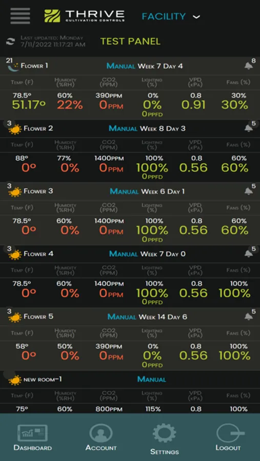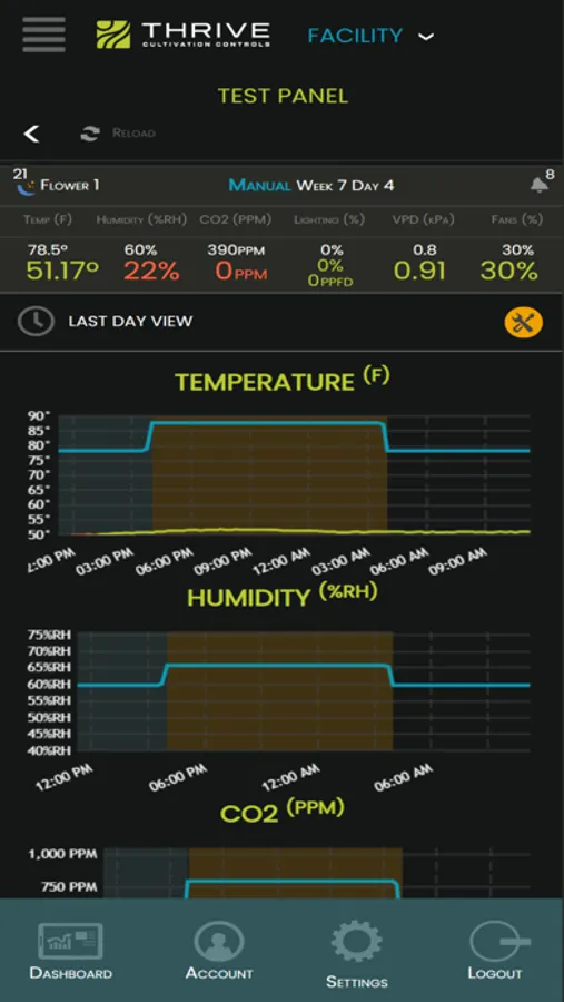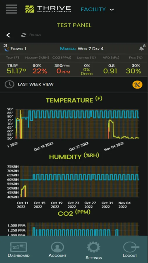 Monitor cultivation facility grow conditions current status and graphing over time to optimize performance and troubleshoot potential issues.