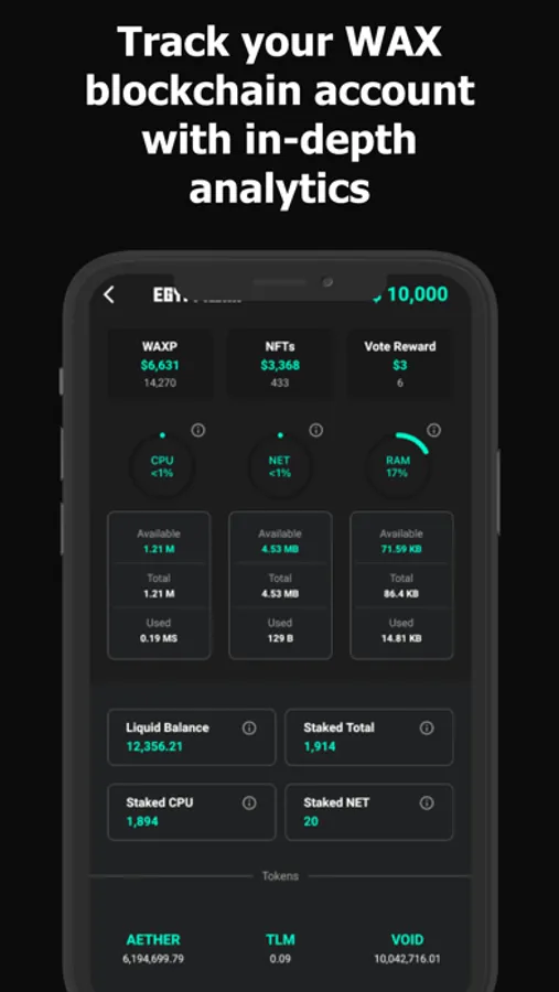 Built into the Token Gamer app is the best and most complete WAX Account viewer and account analytics. With WAX Account analytics, you have comprehensive details on your total wallet value, number of NFTs collected and their value, token amounts, rewards, and more.