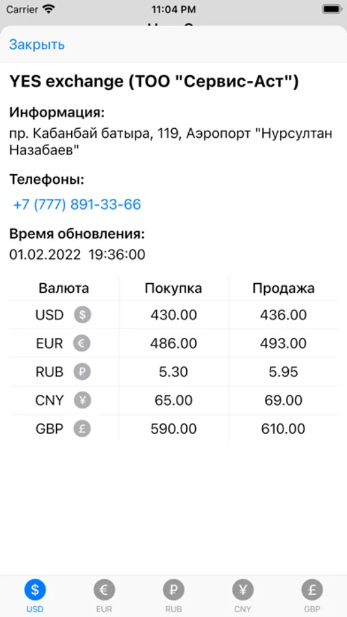 - Подробная информация об обменном пункте (курсы по всем валютам, адрес, телефоны)