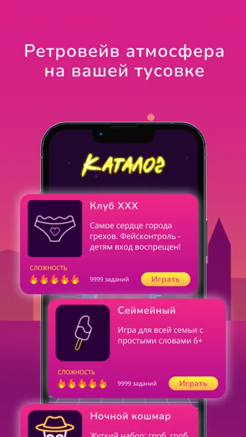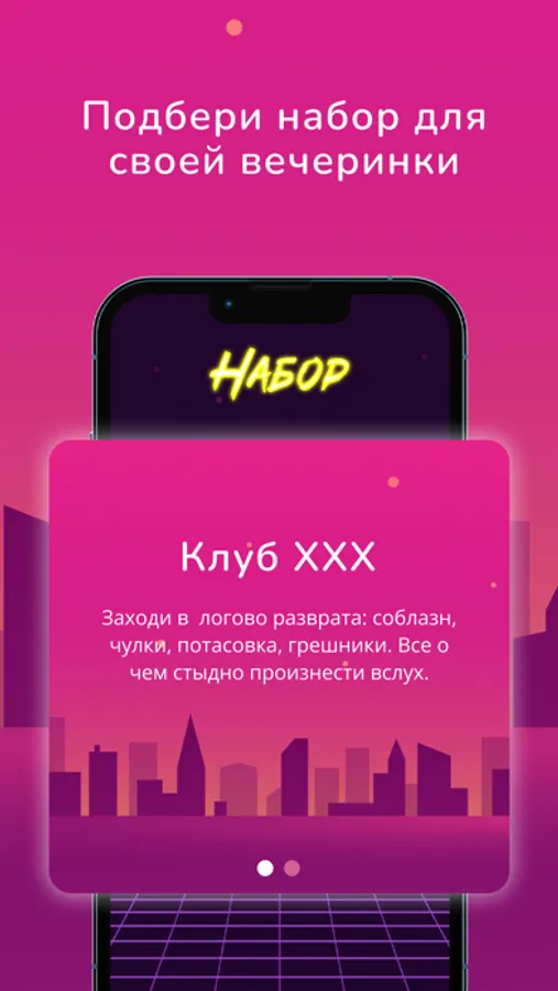 Ретровейв крокодил — для любителей жирных синтезаторов, олдскульных игр и пиксельной графики: старые добрые фантазии двухтысячных о том, как в восьмидесятые фантазировали о двухтысячных. Если вы не понимаете о чем речь, не пугайтесь. Главное, что это самый стильный Крокодил, в который вы когда-либо играли: полный драйва и тусовочной атмосферы. Убедитесь в этом с Неоновым набором — базовым набором с кучей карточек, который подойдет для любой вечеринки. Если вы хотите поиграть со словами попроще, чтобы размяться и понять что к чему — выбирайте Домашний набор. Он подходит и для игр с детьми, чтобы вы могли передать свое мастерство следующему поколению патигеймеров. Если вы знаете, как пропатчить KDE2 под freebsd, ползаете по мировой паутине как человек-паук или просто любите угарнуть с мемасов — набор Хакермен специально для вас. Для месье, которые знают толк в развлечениях и ищут чего-нибудь поострее, предлагаем набор Клуб ХХХ, который заставит покраснеть даже самых бесстыдных. Если вы не боитесь заглянуть в глаза демонов и собственных страхов, рискните заглянуть в набор Ночной Кошмар, где мы собрали самые пугающие слова. Любителям кино, которые всегда мечтали изобразить «Броненосец Потемкин» или Брюса Уиллиса понравится набор Стереокино. Для самых прожженных крокодильщиков, которые клацкая клыками посмеиваются над остальными любителями, мы подготовили набор «Крепкий орешек» с самыми сложными и труднообъяснимыми словми. А если вы не боитесь трудностей и любите историю, выбирайте набор «Машина времени», полный исторических событий, терминов и персонажей. Чтобы расслабиться и отправиться в путешествие, не вставая с дивана (ну хотя бы так), подойдтет набор «Глобальный», с городами, странами и кухней со всех концов земли.