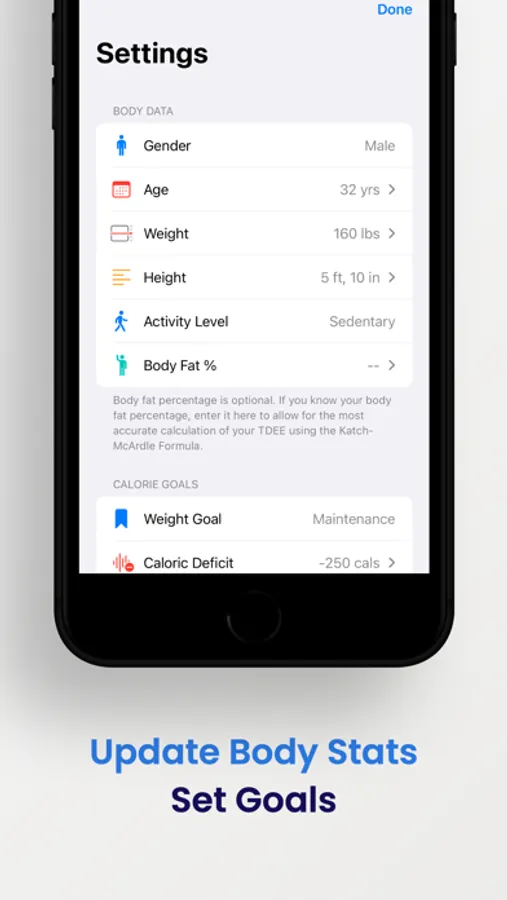 With the ability to update your body stats, you can fine tune your calorie and macronutrient budgets. Whether you're looking to lose weight, maintain your weight or gain weight, FoodSum allows you to add or subtract calories from your budget as needed and gives you greater insight into your goals.