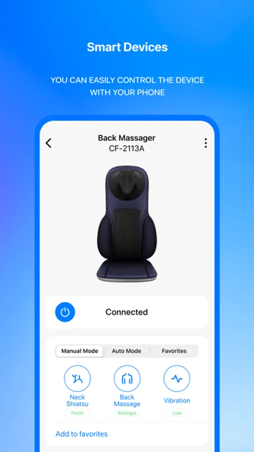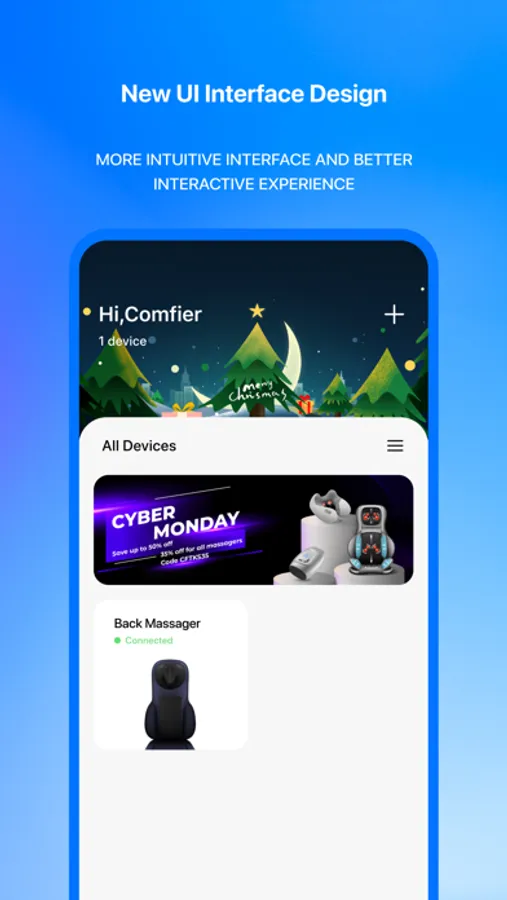 Comfier app is your smart massage device management platform, through Comfier app, you can complete the convenient and fast interaction between your phone and smart massage devices. Through Comfier app, you can also manage and customize your and your family's smart health data and shop for high quality massage devices.