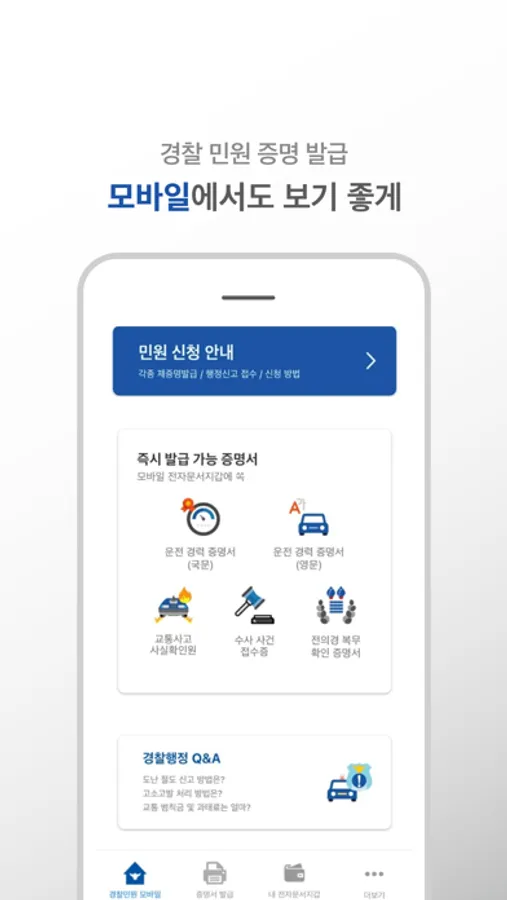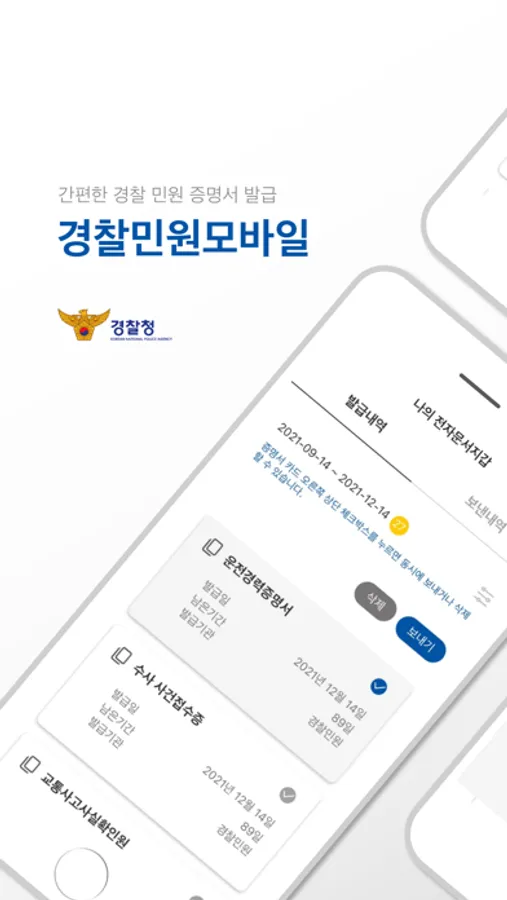 경찰청에서 발급하는 증명서를 모바일로 발급 받고 원하는 기관에 별도 방문 없이 한번에 제출할 수 있는 모바일 어플리케이션입니다.