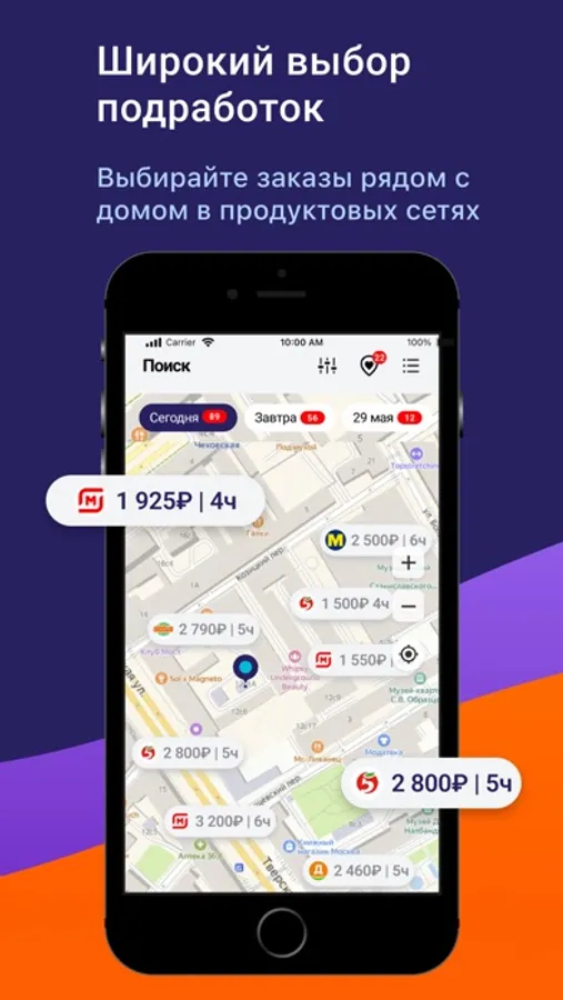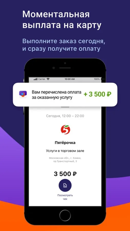 Совмещайте подработку с работой или учёбой. Получайте оплату на карту в день выполнения заказа.