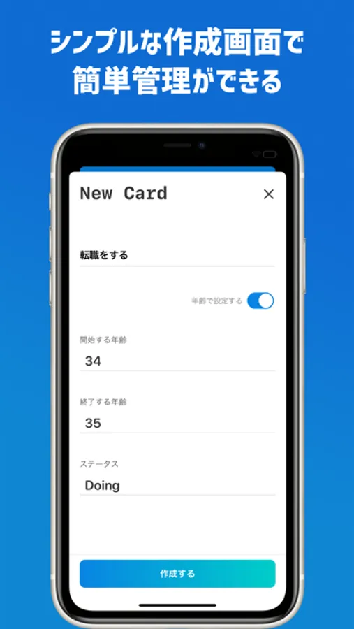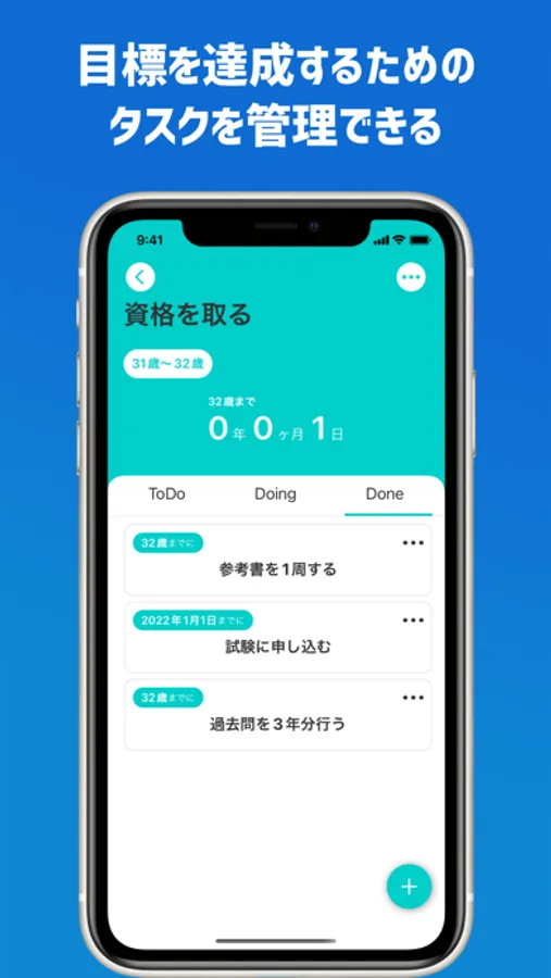 ユーザーの年齢を元にToDoリストで残り日数を確認することができます。例えば、「30歳までに転職する」という計画があれば、残り時間をはじめ、その目標までにどのような行動を行う必要があるのかを整理することができます。また、目標の進捗状況を「ToDo, Doing, Done」の3パターンで管理することができ、いつでも現在の状況を確認することができます。