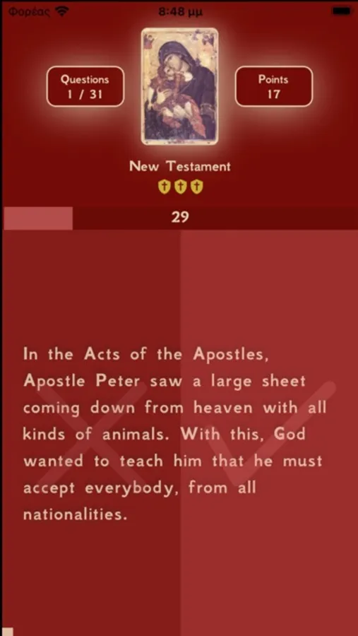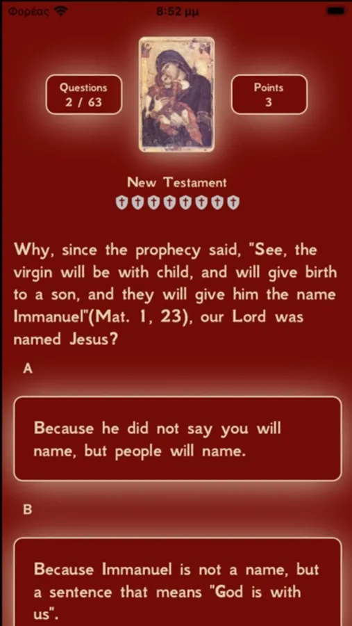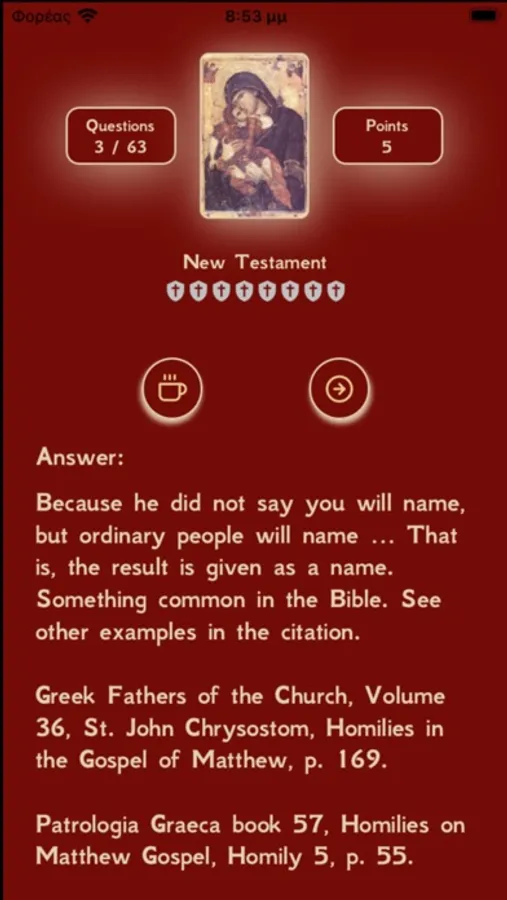 This application is an Orthodox Christian quiz with 264 questions, all followed by detailed answers with references and quotations to the Holy Bible and texts of the Saints.