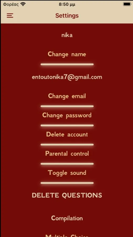 Additionally, you can turn off application sounds or delete a category of questions from your device.