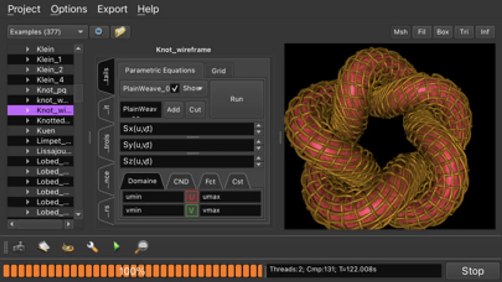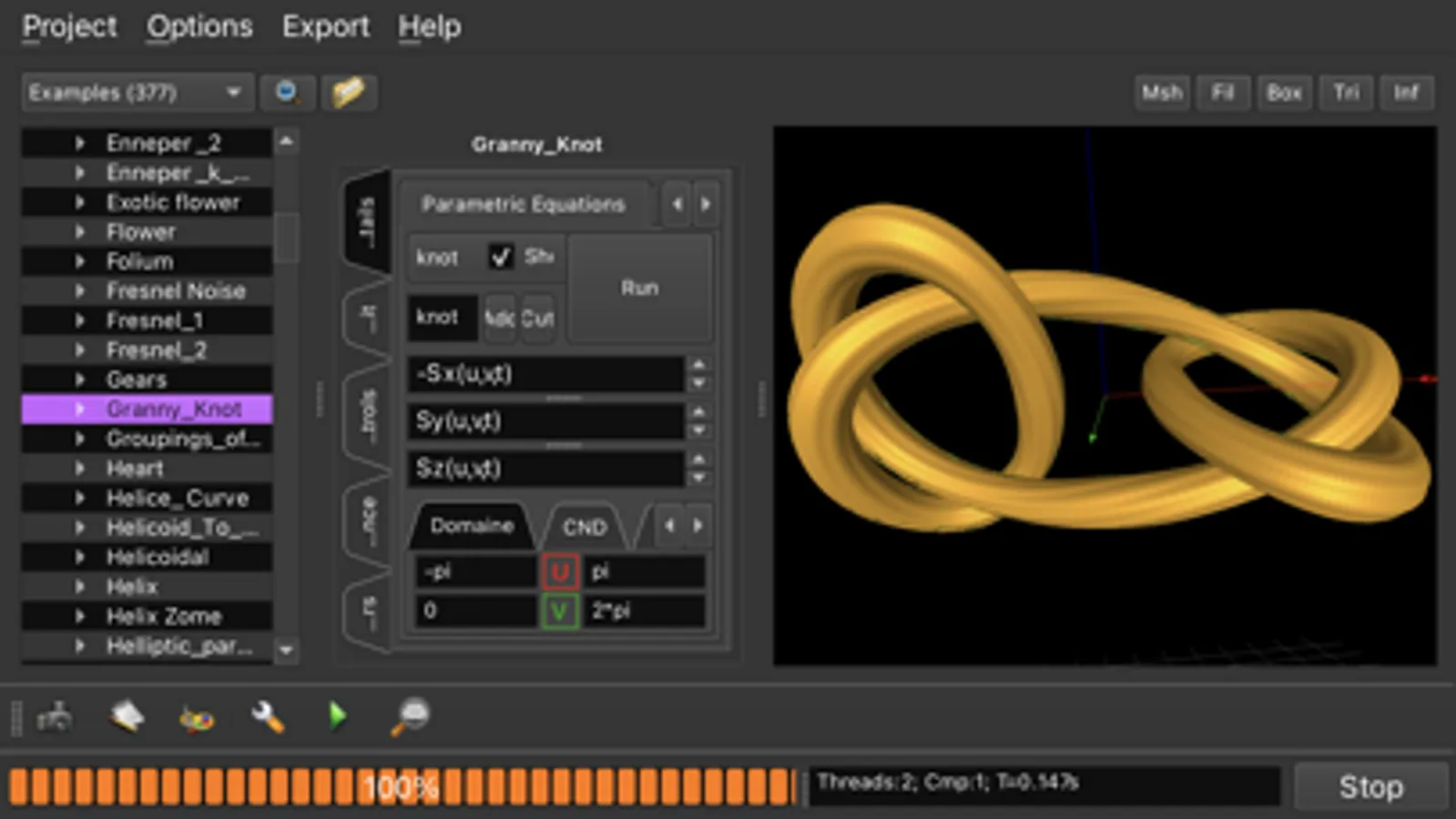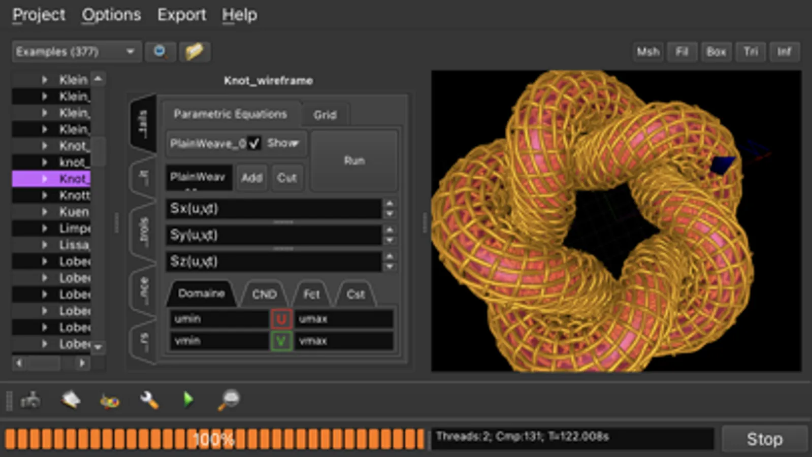 MathMod allows to plot 3D mathematical surfaces, described by implicit or parametric equations, and offers a very large database of model samples that can be generated with it.
