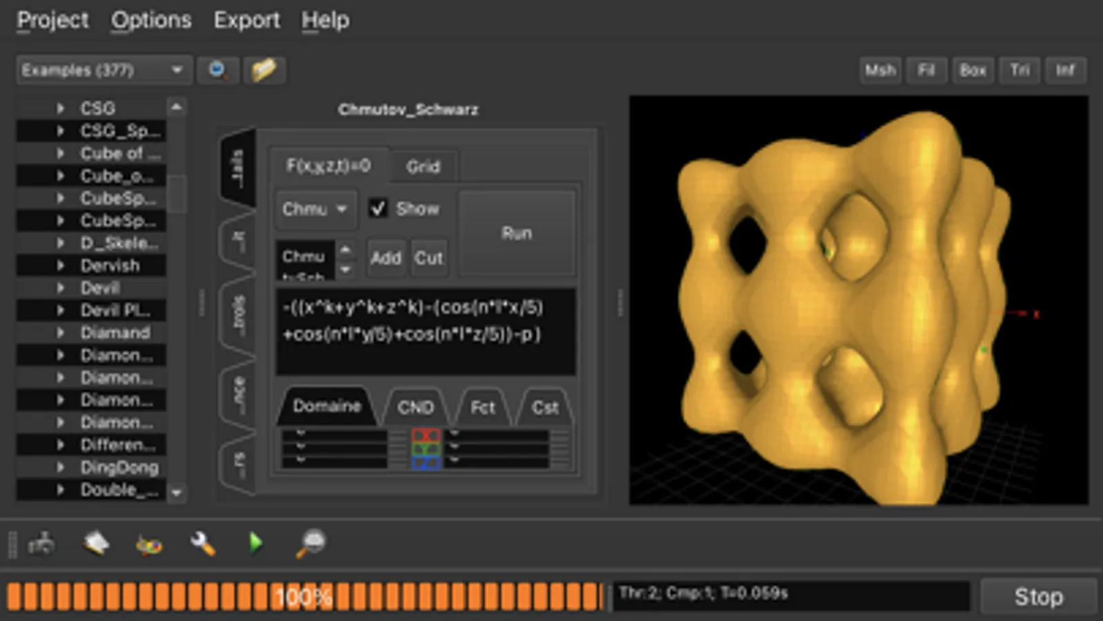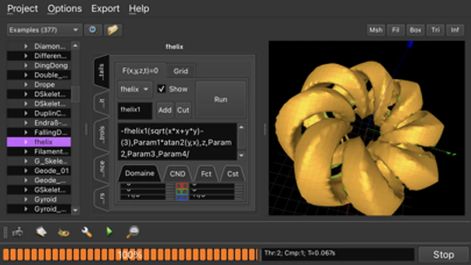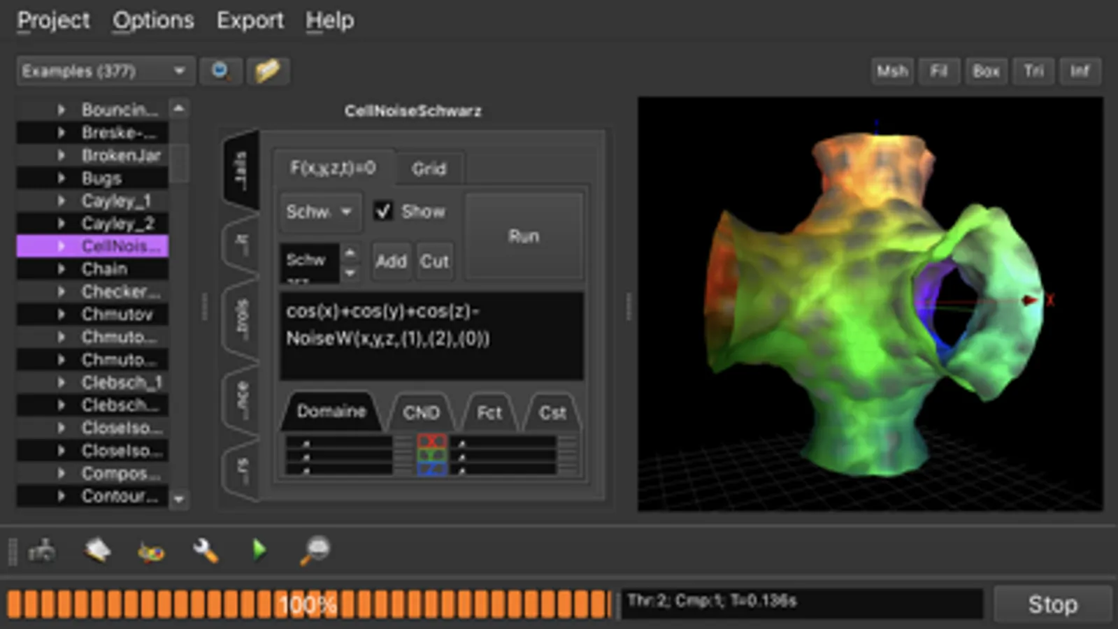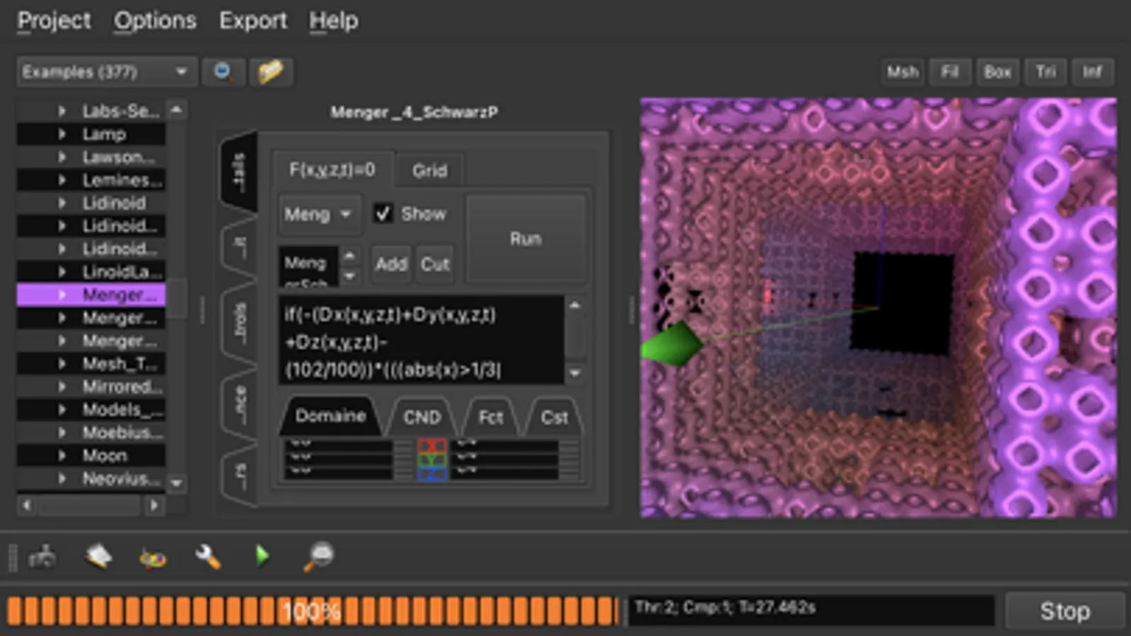 MathMod allows to plot 3D mathematical surfaces, described by implicit or parametric equations, and offers a very large database of model samples that can be generated with it.