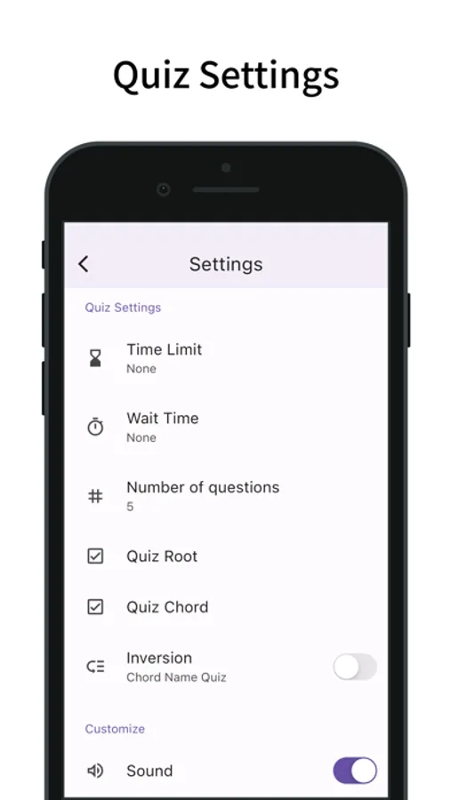 - Quiz settings (time limit, waiting time, number of questions, root note of question, chord of question, inversion form)