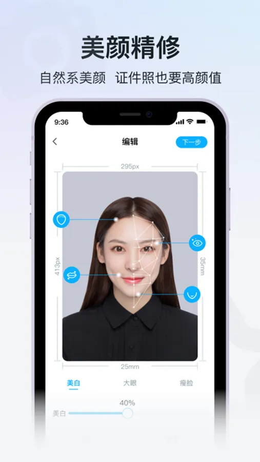 支持手动磨皮、瘦脸、亮肤美白以及各种滤镜、让证件照更自然好看。