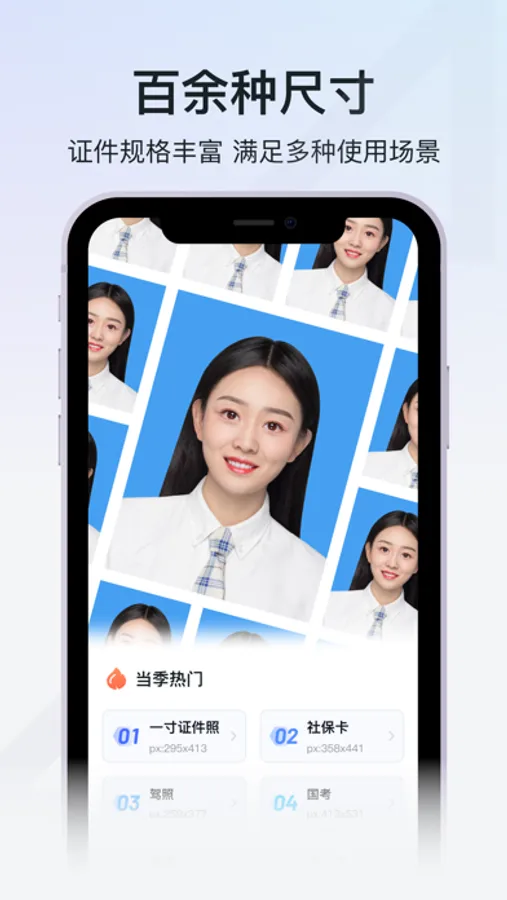 涵盖数百种专业证件尺寸规格,满足各类证件照的使用场景需求。