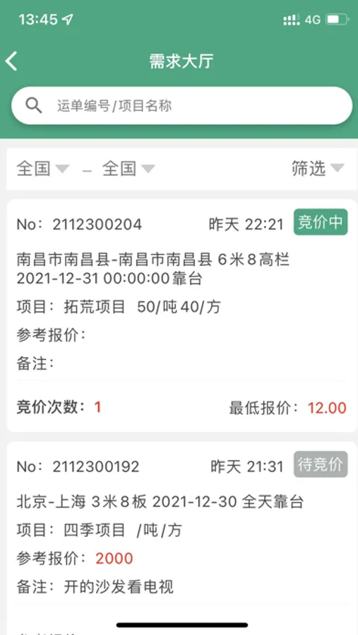 1.司机用户登录后,可以在【需求大厅】中,根据出发及到达省份/城市,挑选自己认为合适的货源