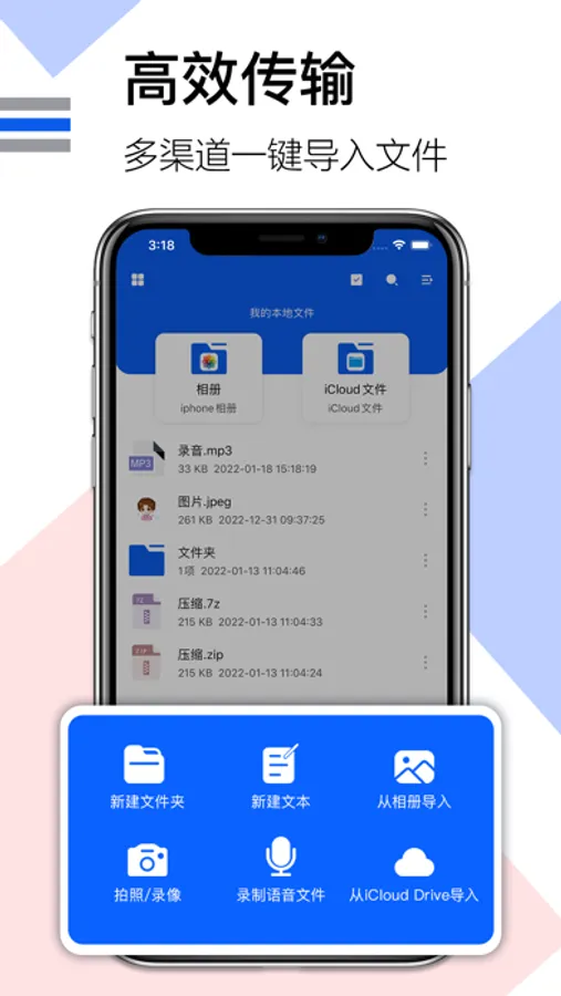 5、多渠道导入:可直接解压iCloud/Dropbox压缩文件,可导入解压邮件、微信等手机内其它软件内的压缩文件。