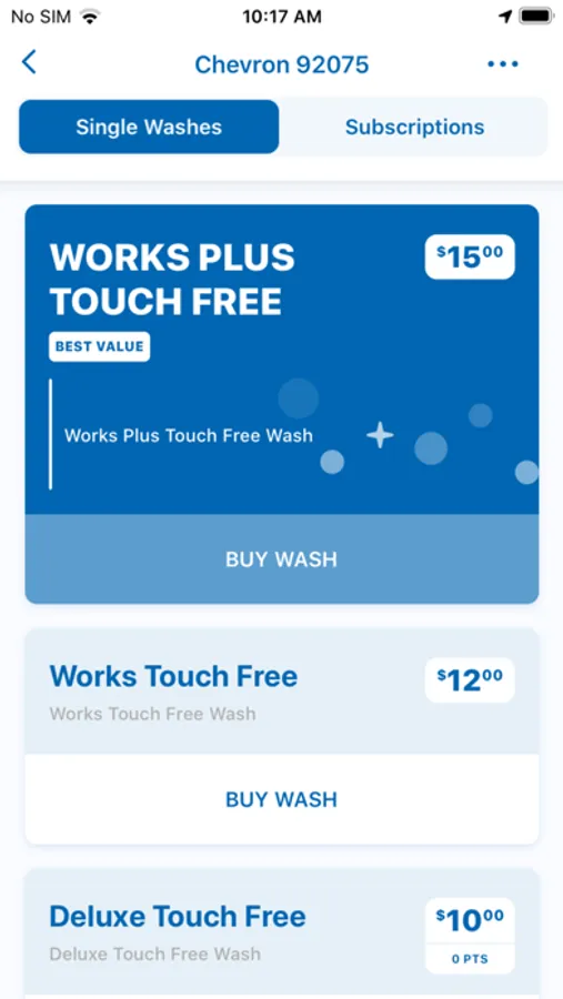 participating Chevron stations (list available in ‘search’ in the app). Browse through the selection of single wash/