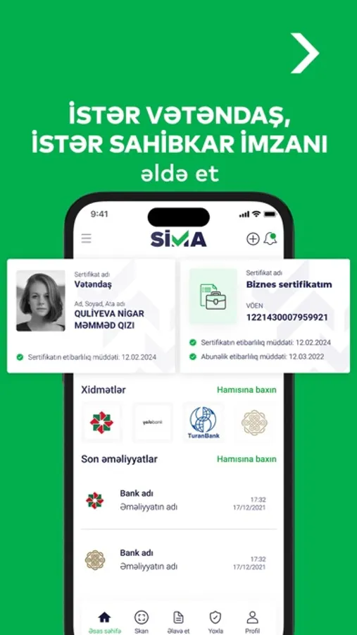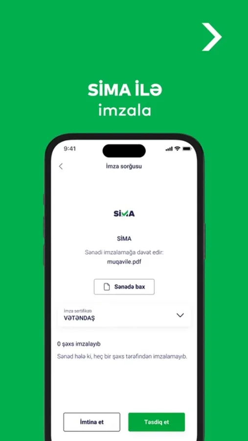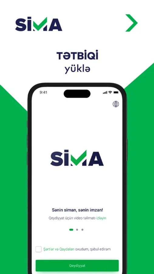 SİMA bulud və üztanıma texnologiyalarına əsaslanan yeni nəsil rəqəmsal imzadır. SİMA mobil tətbiqi əlavə cihazlara ehtiyac olmadan və heç yerə getmədən elekron xidmətlərin əldə edilməsini asanlaşdırır.