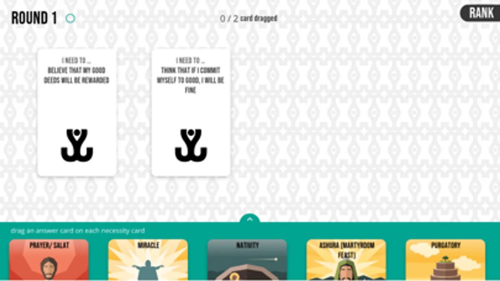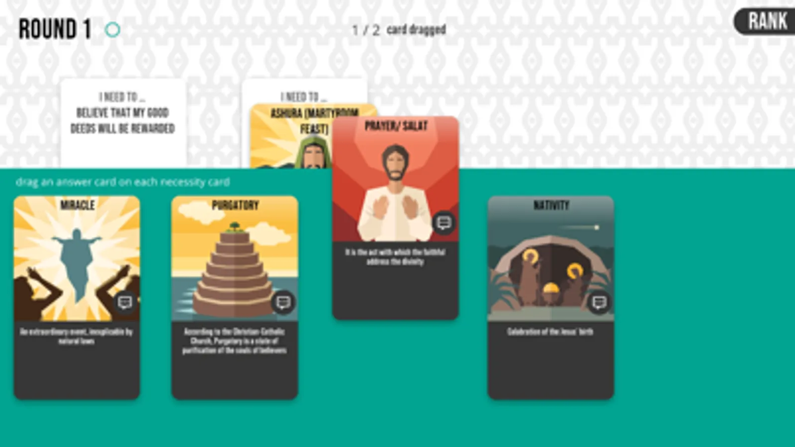 40 Answers is a didactic game aimed at teaching that all religions, although different from each other, share the common function of giving answers to the basic questions and needs of the individual and the community.