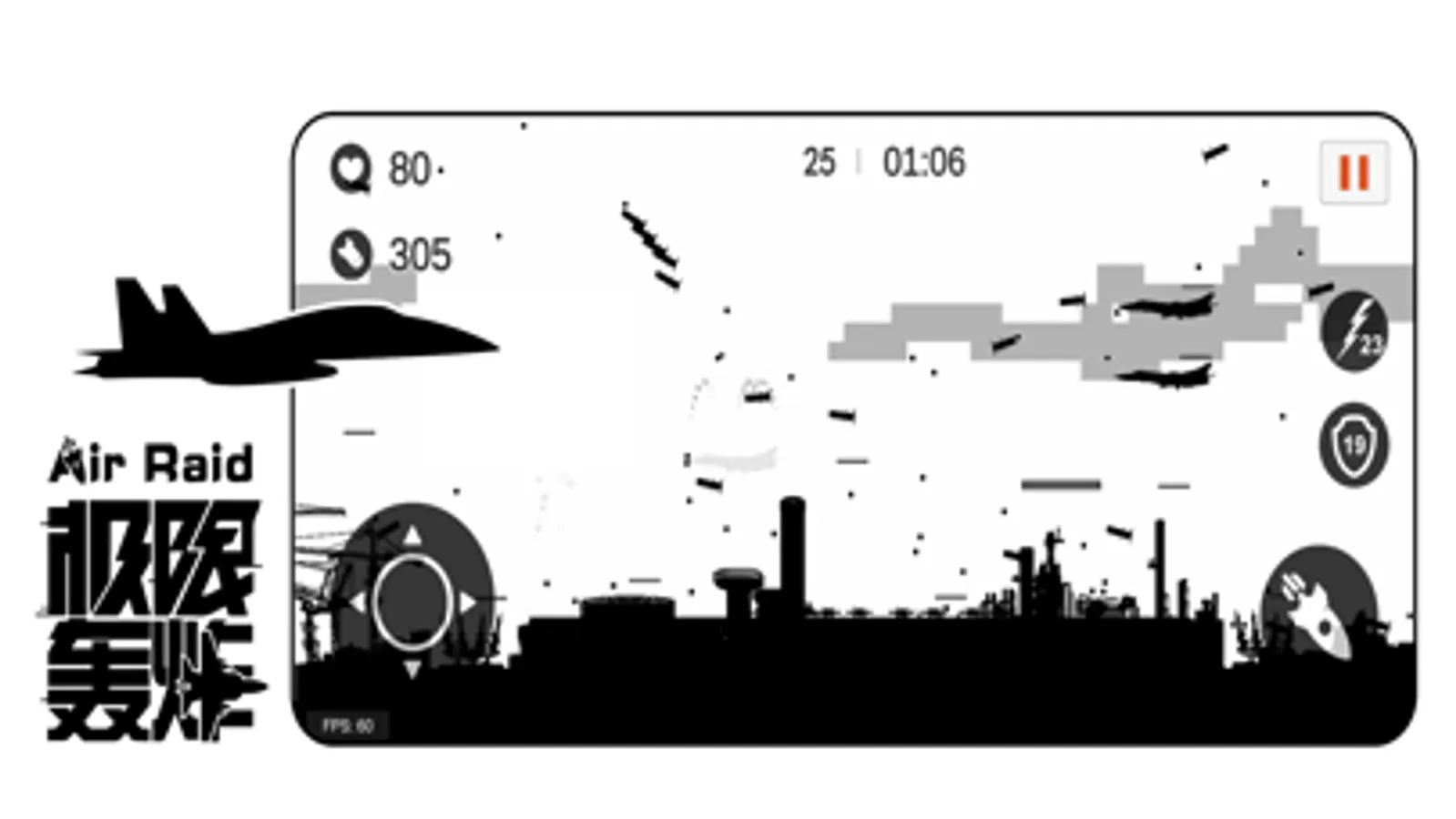 4. 玩法指导:玩家(飞行员)操控一架轰炸飞机,飞机可自动发射机枪子弹,消灭正前方的空中目标,同时可以点击投弹按钮轰炸敌方地面作战单位及建筑物。执行任务中操作飞机上下或者左右来闪避敌方的正前方子弹以及来自地面单位的炮弹和导弹(注意炮弹和导弹可造成较高伤害),从而顺利到达关底。摧毁敌方作战单位及建筑物可获得分数,摧毁数量越多,同时飞机生命值损失越小,获得的总分数越高。在执行任务过程中,可获得弹药、生命、护盾、闪电的补给。随着任务的难度越大,获得的补给种类就越多。当玩家战机生命值为0时,执行任务失败,需重新过关后才可进入下一任务关卡。