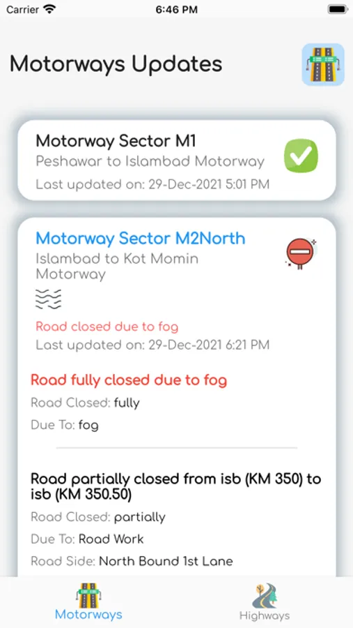 Motorway fog updates is the ultimate travel assistant. Get instant information about the current status of all major motorways and highways in Pakistan. With one click, it will give you weather updates, road maintenance, roadblock, fog or public protest for your next trip.