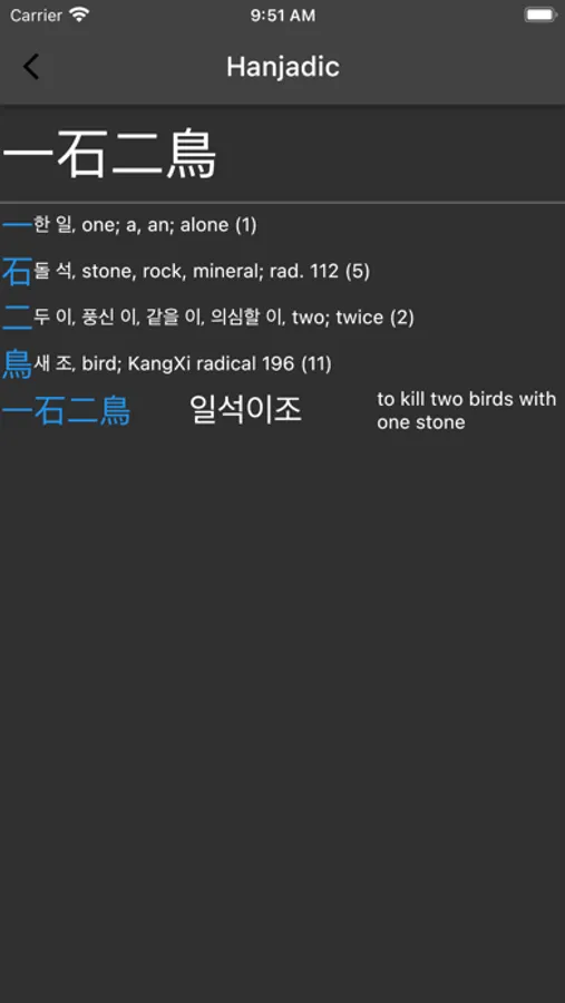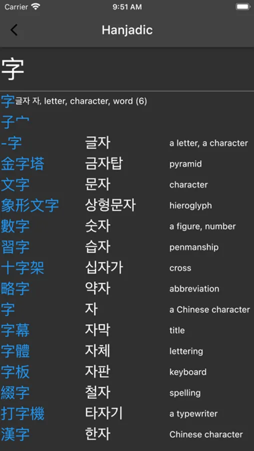 70-80% of Korean words are based on Chinese words. By learning the sound and Hangeul spelling of Chinese roots you can increase your Korean vocabulary. Using this app you can look up any word or character in English, Chinese or Korean and see all related words.