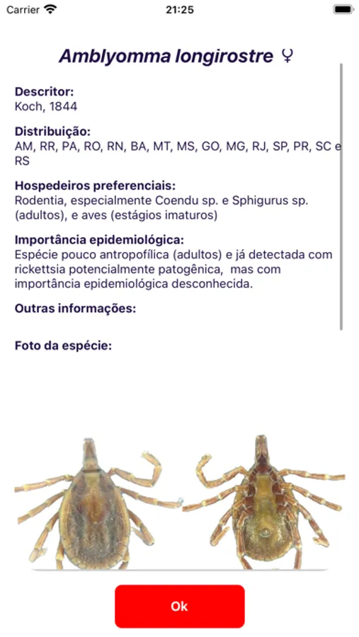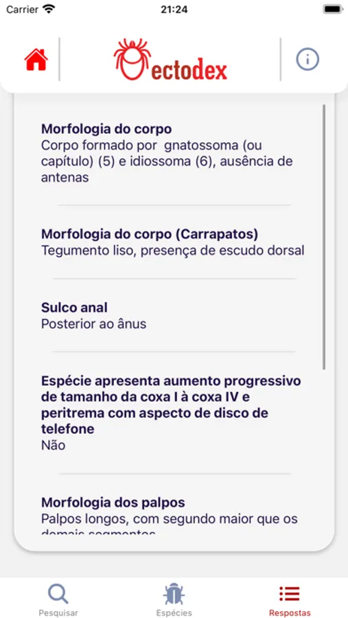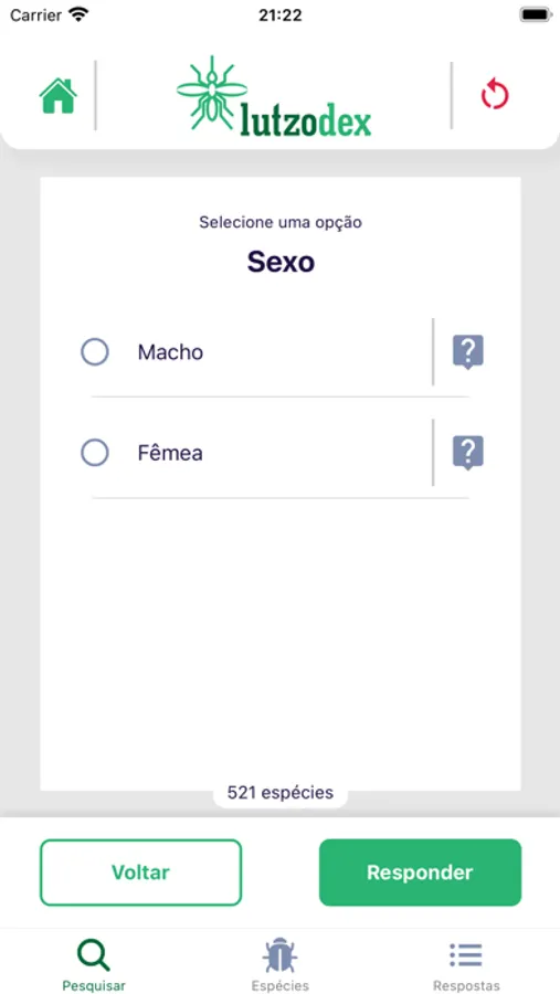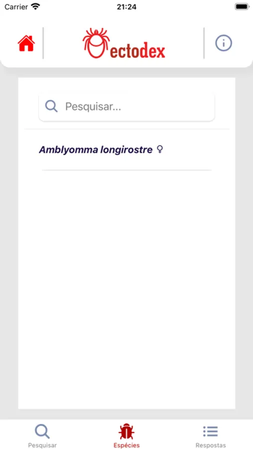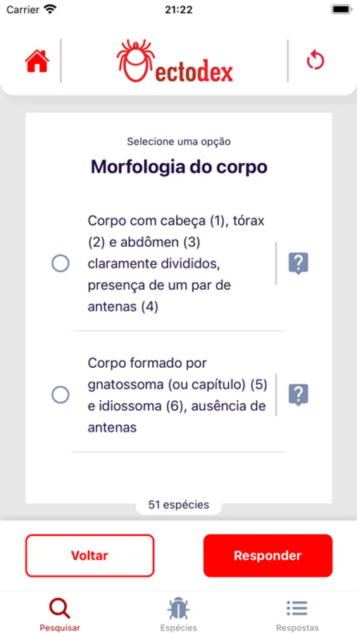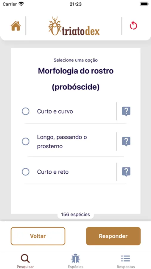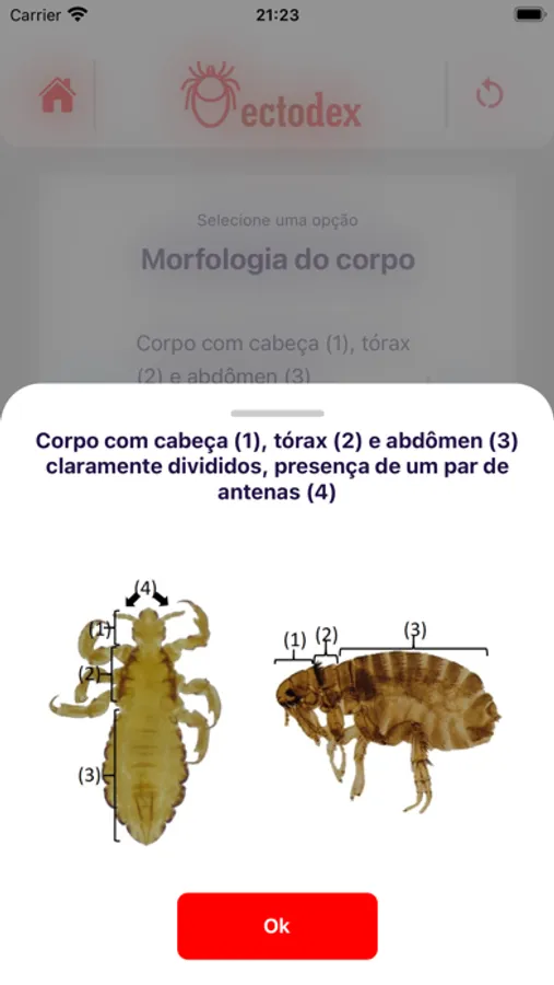 With VetorDex, the morphological identification of sand flies (Diptera: Phlebotominae), Triatomines (Hemiptera: Reduviidae) and ectoparasites (Insecta: Phthiraptera; Hemiptera; Siphonaptera and Arachnida: Ixodida) has become easier. This application deviates from traditional dichotomies and presents up to eight answer options to a question. There are images that help in observing structures for all stages. In each question, the number of possible species is presented. At any time, you can access the answered questions and correct the steps if necessary. In the list of possible species, information about the descriptors, geographic distribution and medical importance of the species can be accessed.