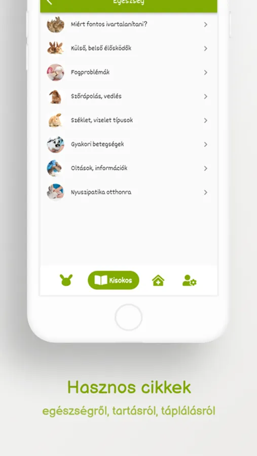 Az alkalmazásba beépült egy kisokos is, ami számtalan nagyon hasznos cikket tartalmaz a nyuszis tartással és egyéb releváns témákkal kapcsolatban.
