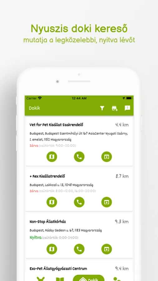 További nagyon hasznos funkciója az alkalmazásnak a nyuszis doki kereső, aminek segítségével a legközelebbi, nyitva lévő egzós / nyuszis rendelőket megtalálhatod.