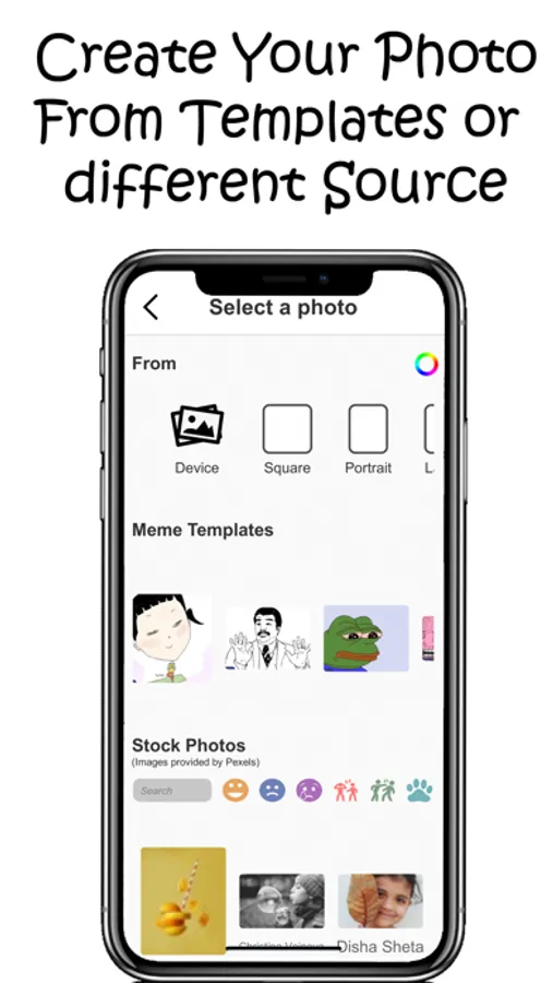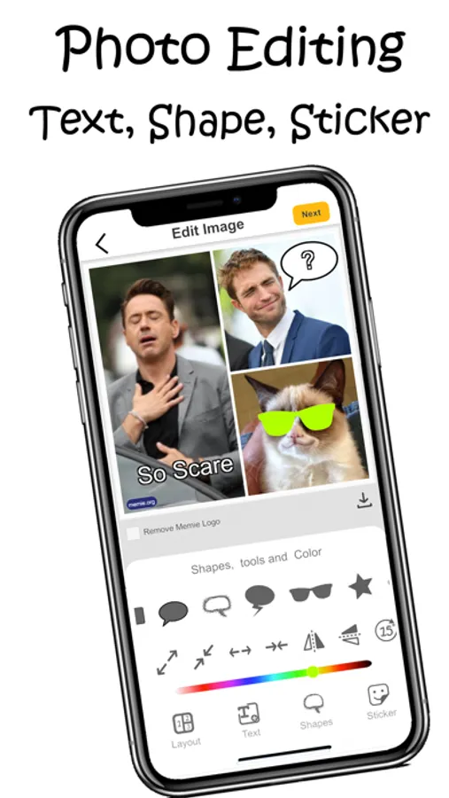 Create your own meme images with online templates uploaded by other users. You can edit from the template, add texts, shapes and sticker, apply filter and collages.