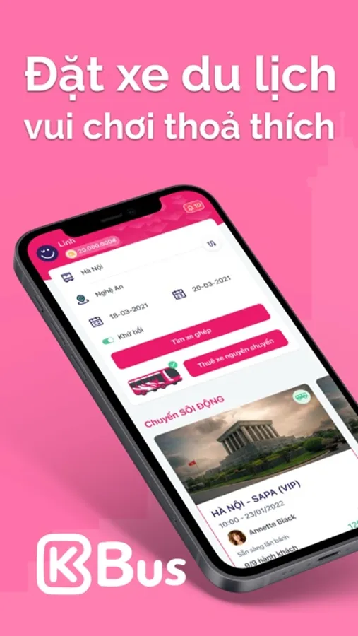 KBus là nền tảng công nghệ kết nối xe vận tải du lịch với hành khách có nhu cầu thuê xe chung cùng nhau. Tại nền tảng KBus người dùng có thể lựa chọn các chuyến đi do cộng đồng tạo ra và chia sẻ tiền thuê chung chuyến đi đó hoặc Chủ động tạo ra một hành trình theo ý mình và cho phép cộng đồng cùng nhau chia sẻ để thuê chung chuyến đi. Chính điều này đã tạo nên sự độc đáo của mô hình giúp cho hành khách tiết kiệm từ 30% -50% chi phí di chuyển so với cách di chuyển thông thường đồng thời giúp cho các doanh nghiệp vận tải tận dụng được phương tiện dư thừa tăng hiệu quả khai thác và nâng cao hiệu quả kinh doanh.