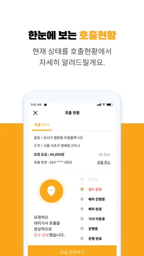 4) 실시간 호출현황 보기: 자신과 대신 불러준 대리운전 기사 호출 현황을 접수부터 운행상황까지 한눈에 볼 수 있습니다.