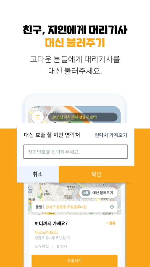 2) 대신불러주기: 친구나 지인의 대리운전 기사를 대신 호출(결제 포함)하는 기능을 제공합니다. 동시에 여러 건을 대신 불러줄 수 있기에 술자리에서 음주운전을 막아주는 멋진 사람이 될 수 있습니다.