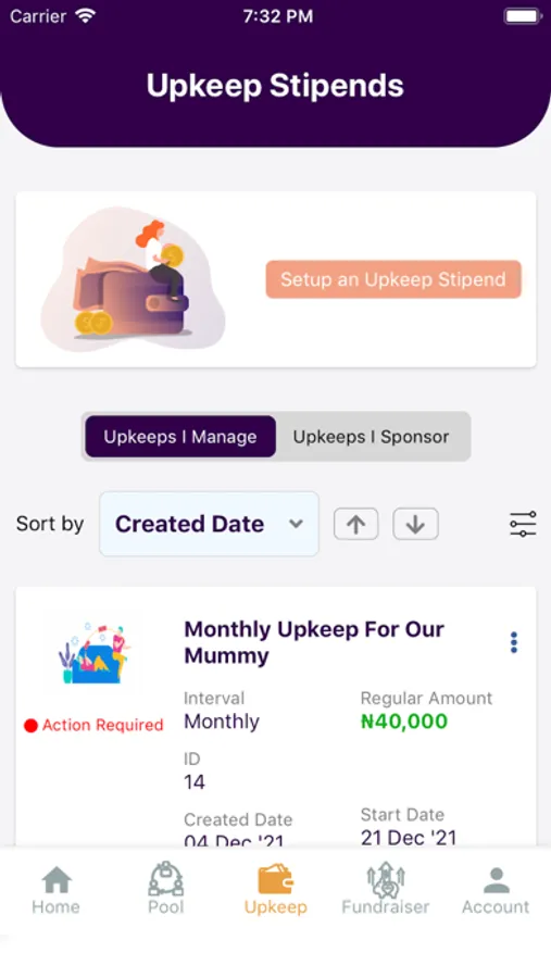- Upkeep is a scheme whereby one person or a group of sponsors agree to contribute a regular amount of money to a single beneficiary like dependent parents or siblings. It can also be setup for the regular upkeep or maintenance of a common project or a set goal. Each sponsor can choose to overpay or underpay their accepted pledged amount.