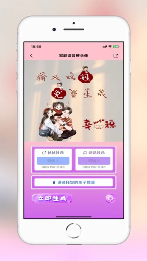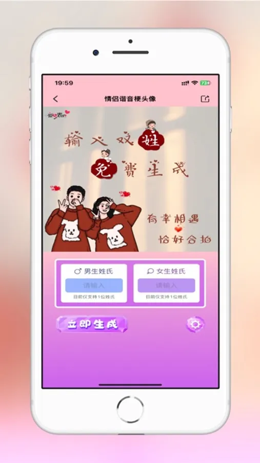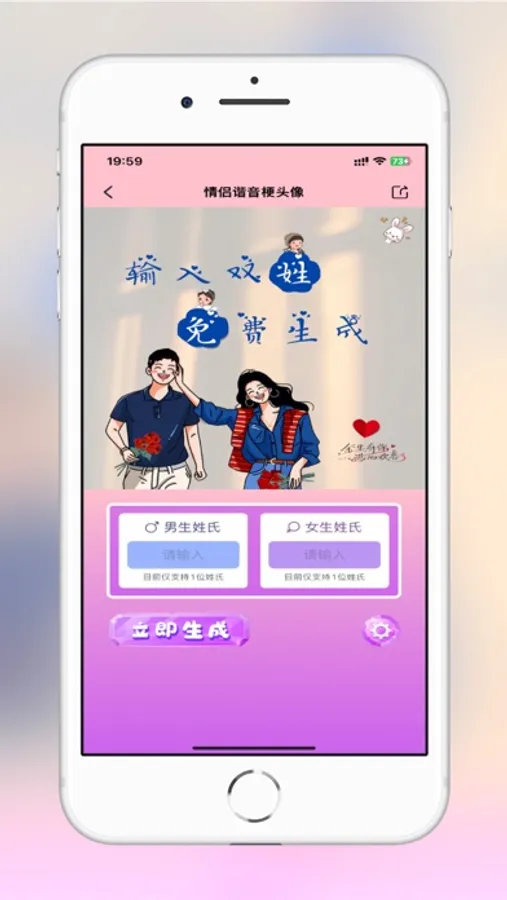 只需输入男方与女方姓氏,立即免费生成目前火热的姓氏谐音梗头像,快来试试吧~
