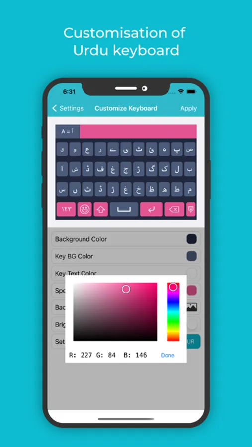 • Change colours for the Background colour, Key background colour, Keyboard text colour, Suggestion box colour etc, so that typing does not seem boring and monotonous with this Urdu keyboard for iOS.