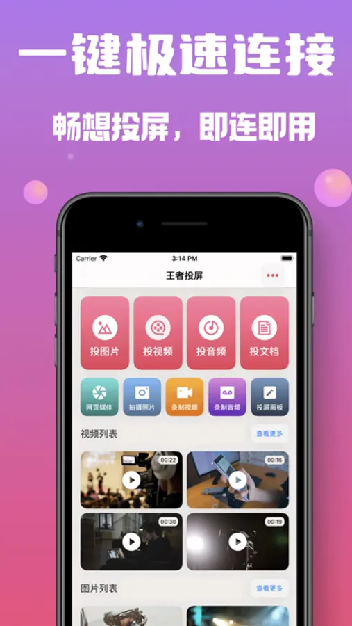 全新王者手机投屏软件,当你想把手机的照片、视频、音频投放到电视时,只需要使用王者手机投屏软件,可以轻松投放。