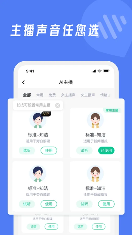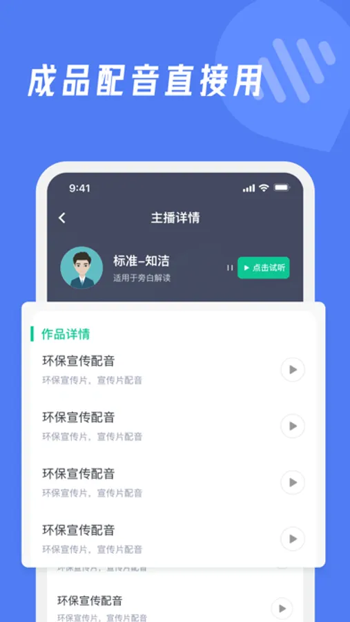 2.海量配音素材:拥有超多主播声音可选择,可以查看主播配音案例来选择使用。