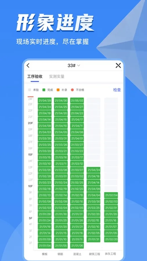 形象进度立面图,各工序进度一目了然; 工序验收马赛克,风险实时预警,验收数据留痕。