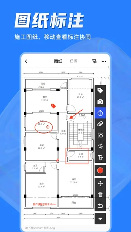 随时查看项目图纸; 随手创建图纸标注; 实时更新同步图纸标注。