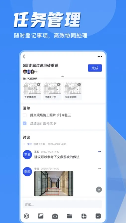 基于图纸、工序、分部/分项创建管理任务; 根据事项随时协作沟通,上传现场照片/视频/文件 。