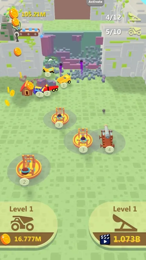 Smash walls, mine resources, sell them at the base and upgrade your catapults to get even more resources!