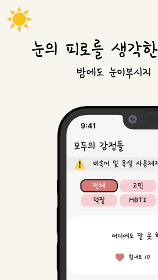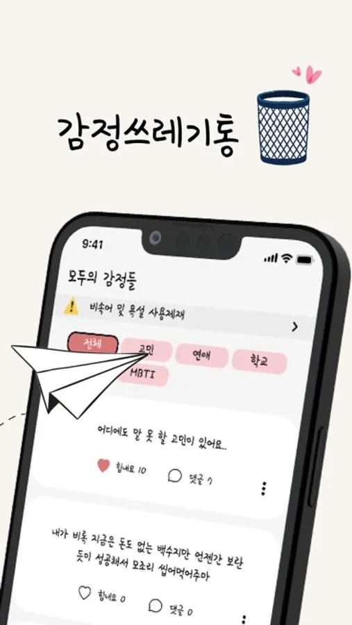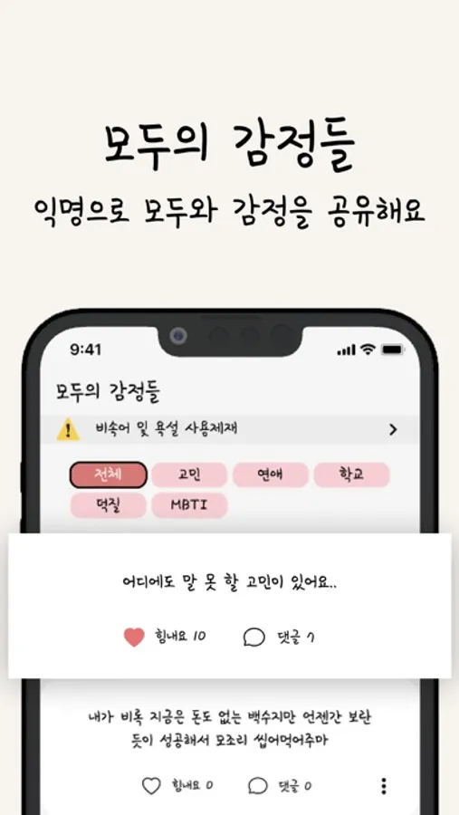 완벽히 보장되는 익명성을 통해 서로 고민을 공유하고 위로 받으세요.
