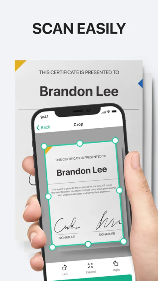 Our app will find the borders of the document itself, so that you only get what is needed, or customize the area by yourself.
