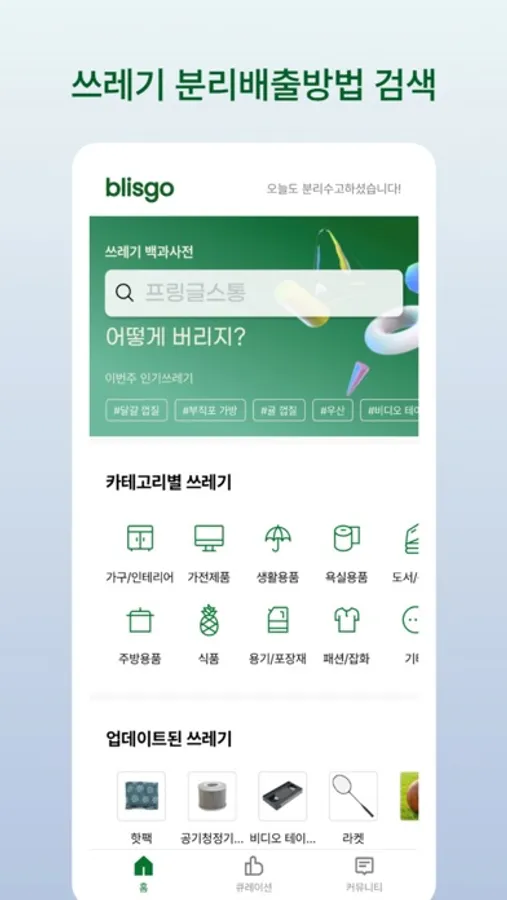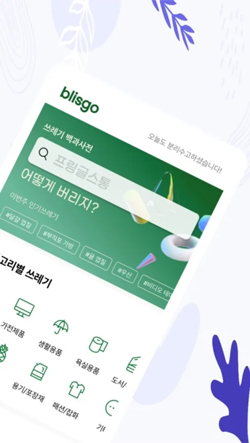 블리스고는 쓰레기를 통해 누구나 쉽게 따라할 수 있는 친환경 라이프스타일을 전파합니다. 모두를 위한 에코 라이프 플랫폼을 꿈꿉니다.