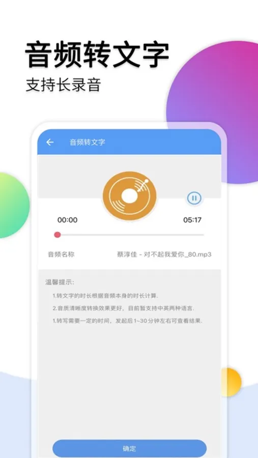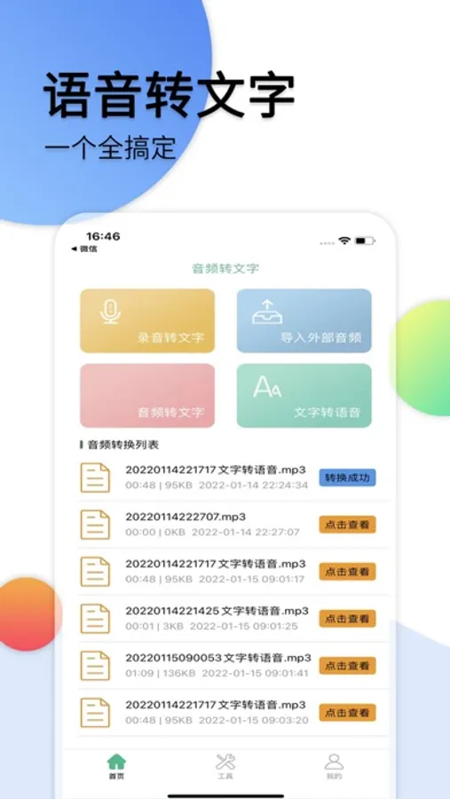 - 「长音频转文字」全新支持60秒以上的长音频转文字,支持语音转文字、音频转文字,识别率高,外部音频导入,快速上传,一键转写