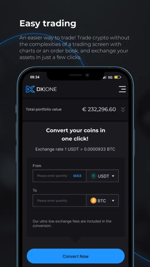 Whether you’re a beginner or pro trader, we’ve got you covered! DXONE offers different ways to get involved, whether you're a beginner or a pro. DXONE excels at making trading and buying crypto really easy both for users who are into crypto for the long haul, as well as those who need a quick, reliable fiat on- and off-ramp solution. Choose from Basic or Advanced platforms to suit your requirements and trade at a level you feel comfortable with. Our Easy Exchange is a favourite with many users, enabling you to trade crypto without the complexities of a trading screen with charts or an order book, and exchange your assets in just a few clicks.