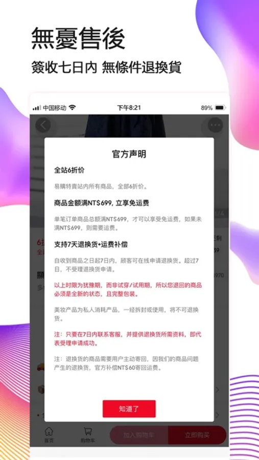 支持簽收後7天內無憂退換貨(此為猶豫期,非試穿期,所以退回商品必須是全新狀態且包裝完整喔);
