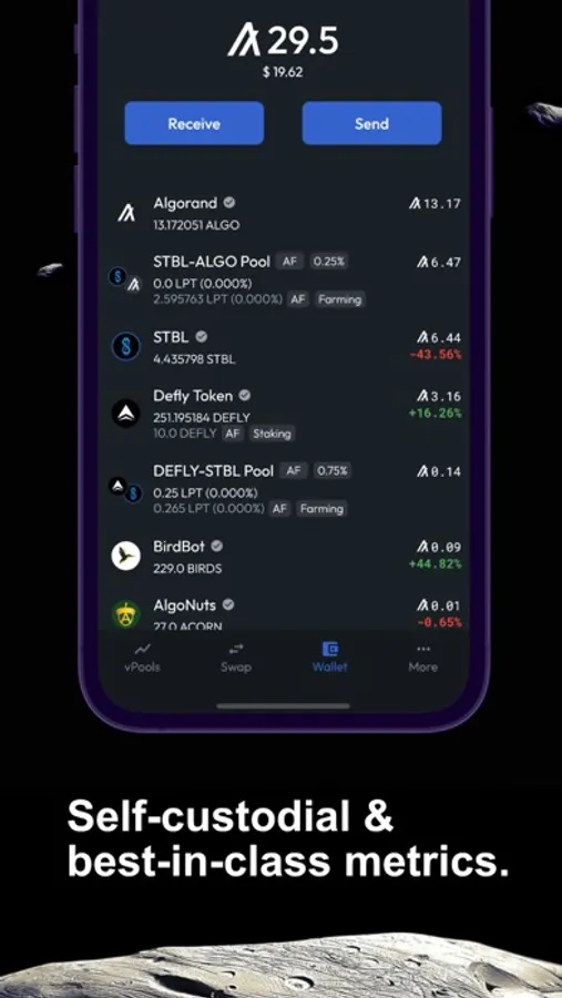The Defly Wallet connects to the Algorand ecosystem. It links to any existing Algorand account and displays analytics and stats based on the publicly available data on the blockchain. For the full feature set (swapping and sending funds) the app can safely store your private keys. These keys are stored locally and fully encrypted.